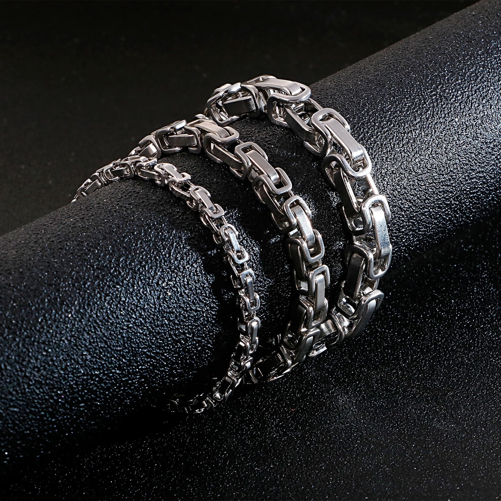 Bright Steel Box Chain Byzantine Chain Necklace. A Byzantine chain has a rope-like texture and an organic design that is used in jewelry. There is a good drape to these chains, as they are supple and flexible. Byzantine is an unidentified name. It is a four-in-one chain, which means that each link passes through four others. Byzantine chain links alternate in direction, unlike Box chain links that point in a constant direction.